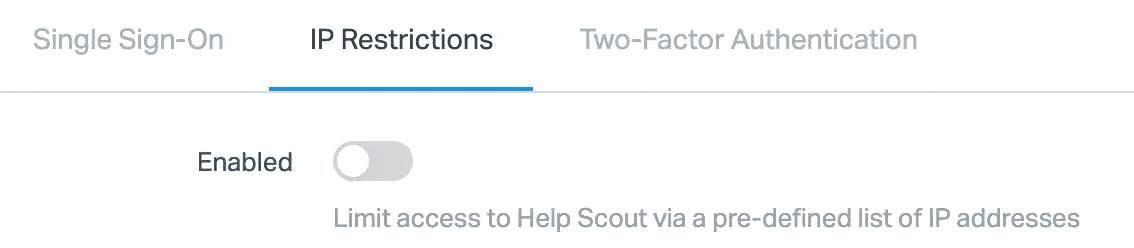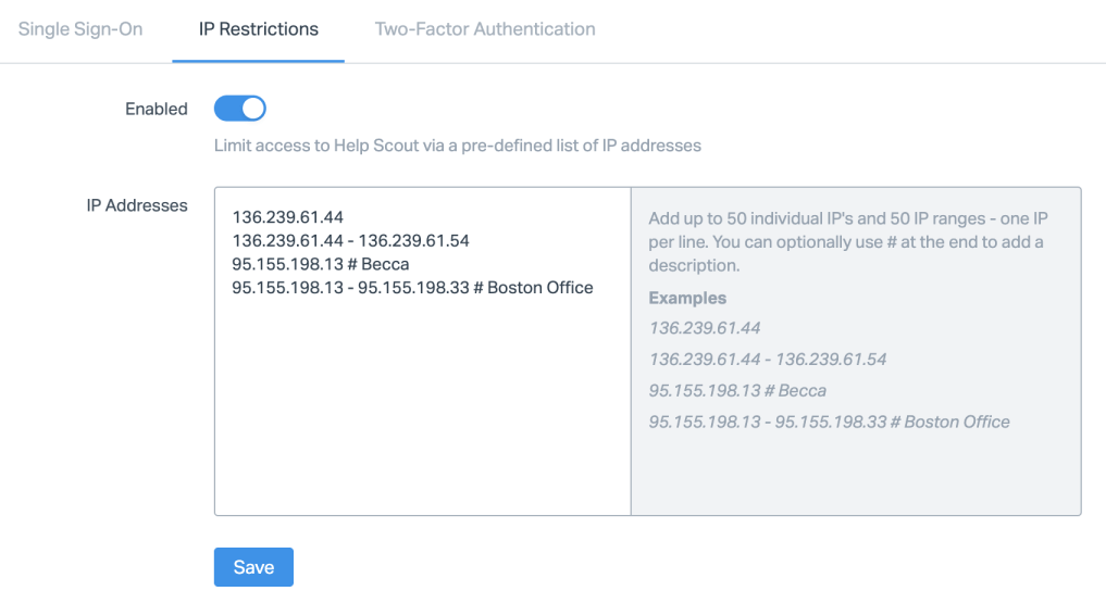 With IP restrictions, enter up to 50 individual IP addresses or IP ranges containing any number of IP addresses. Your Help Scout users must be accessing Help Scout from one of the allowed IP addresses included in that list or included in a range in that list to log in. Users with IP addresses that do not match the addresses on the allowed list will receive an error when attempting to log in.