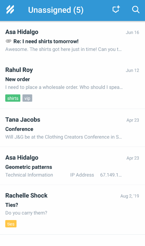 Just tap the mailbox name from the dashboard screen to enter a mailbox. To get back to the dashboard, swipe to the right or tap the Help Scout logo in the top left corner and choose a different mailbox or folder to switch between them.