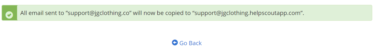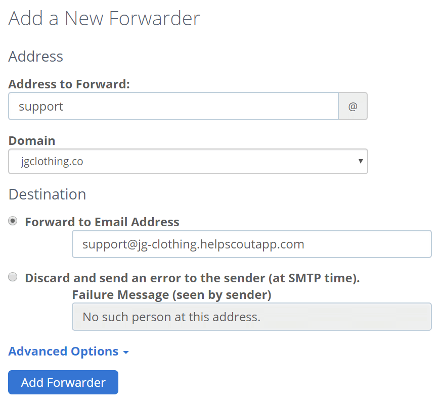 Enter the email address you want to forward to Help Scout. In this example, we want to forward support@jgclothing.co, so we typed in support to the Address to Forward: field and chose jgclothing.co from the Domain list. Next, paste your Help Scout mailbox address in to the Forward to Email Address field. Click the Add Forwarder button.