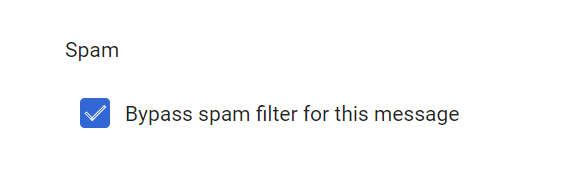 Optional: We recommend also checking Bypass spam filter for this message under the Spam header in this section. Google will not route email its filter designates as spam otherwise, which can result in valid email not reaching your Help Scout mailbox without any warning to your team. Help Scout's spam filter will still apply when the emails reach your mailbox. See Manage Spam and Unwanted Email for more.