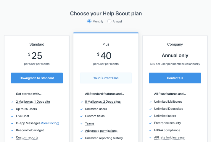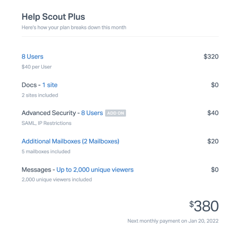 Help Scout offers several different plans with different features and limits, as well as add-ons that are available to specific plans, allowing you to choose the plan and extras that meet your needs.