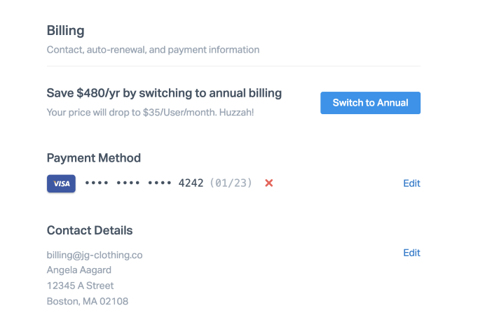Scroll down on the Your Plan page to change the credit card that your account is billed to and switch between monthly or annual payments.