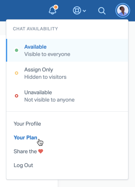 Click the Account icon in the top-right hand corner of Help Scout, then select the Your Plan option from the dropdown menu.