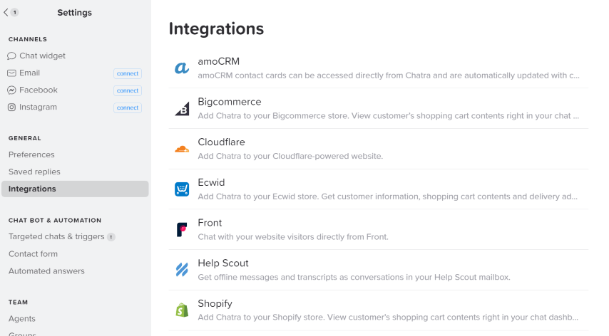 Log in to your Chatra account at app.chatra.io. Click Settings in the left sidebar, then Integrations.
