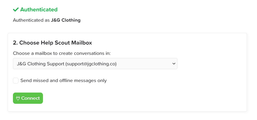 Choose the Help Scout Mailbox you want Chatra messages to flow to and click Connect. Choose Send missed and offline messages only if you don't want to store completed Chatra chats in Help Scout.