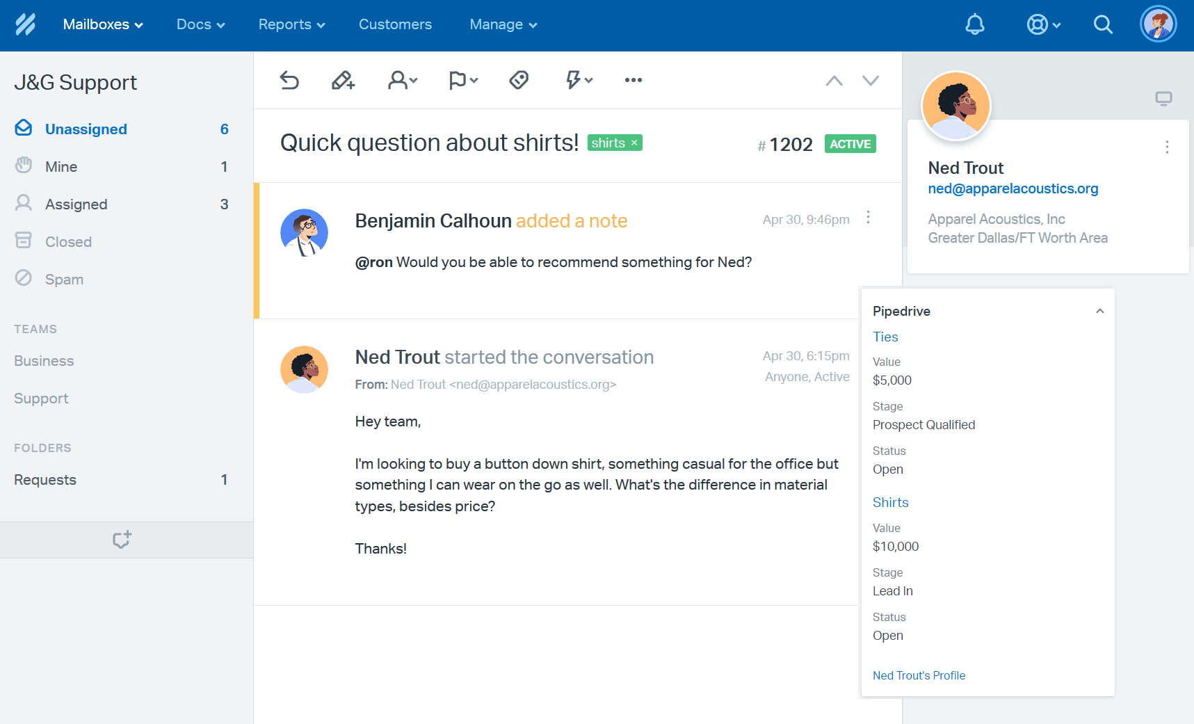 Add the Pipedrive app to add a link directly to your customer's Pipedrive profile to your conversation sidebars. The sidebar will also display up to three Pipedrive deals, taking key data points — deal value, pipeline stage, and status — and neatly show them in your customer sidebar. Here's a snapshot of how it will appear in Help Scout: