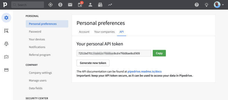 Log in to your Pipedrive account. In Pipedrive, click on your profile icon in the top right corner of the page, and choose Settings.