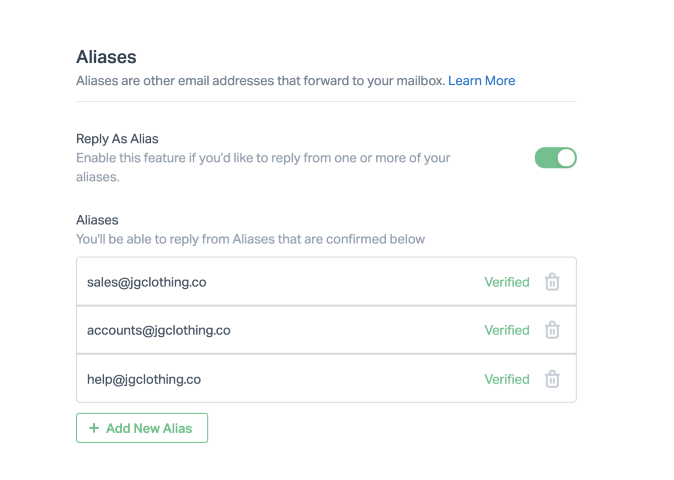 Finally, you'll need to add the address for the mailbox you're deleting to the Aliases field of the mailbox you're keeping. This will ensure that Help Scout knows to associate any emails from the deleted mailbox's address with the new mailbox they're being sent to. Take a look at Forward Email Aliases to a Mailbox for more information on Aliases in Help Scout.