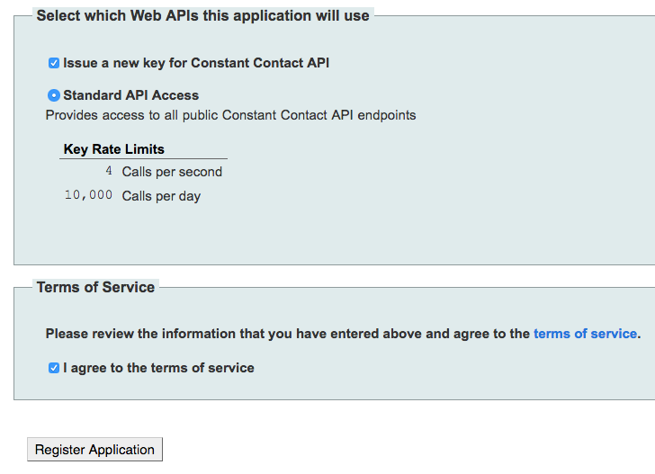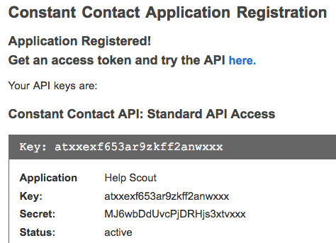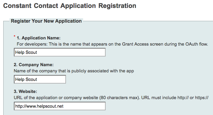 Register your application (Help Scout) with Constant Contact. Fill out the form will the following values: