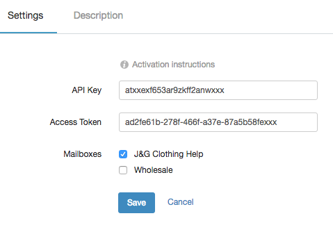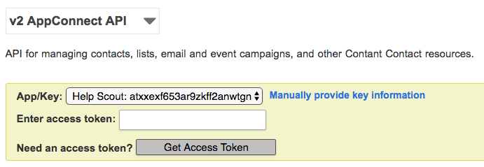 From Help Scout, install the Constant Contact app to wrap up. Paste your API key (referenced in the first step) and your access token in to the corresponding fields. Select which mailboxes you'd like to connect, then hit the Save button.