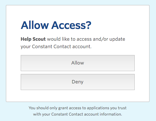 On the next page, you'll be prompted to grant access to Help Scout. Click the Allow button! You'll be redirected once more to a page containing your new access token. Copy your token and head over to Help Scout.