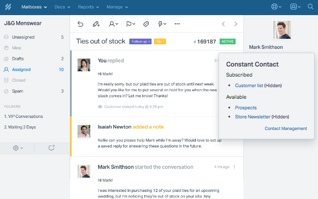 Constant Contact is a tool for businesses to manage their email newsletter and customer marketing. Their suite of products not only includes email marketing, but also event registration, surveys and promotions. The Help Scout app instantly connects your customer to their Constant Contact profile. You can see the lists they are subscribed to and have one-click access to the Contact Management screen in Constant Contact. Here's a snapshot of what it looks like in Help Scout: