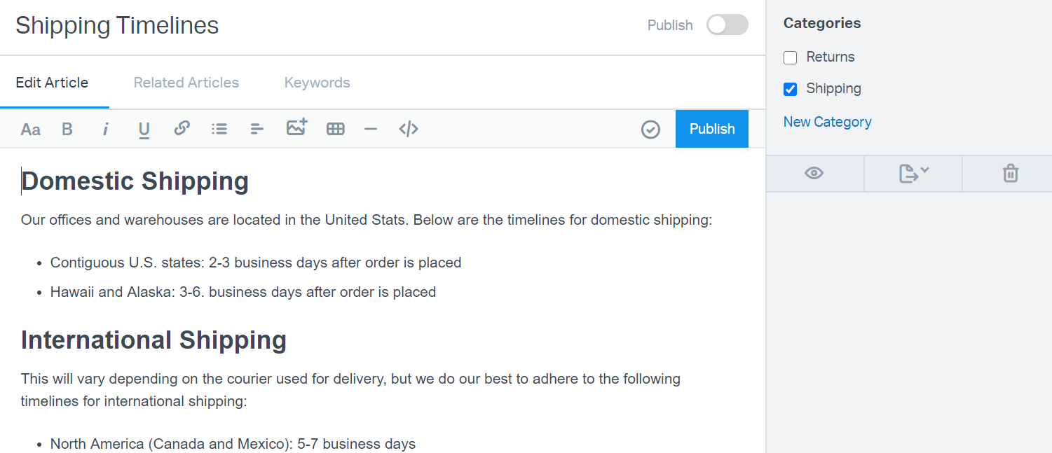 Click on the eye button to Preview your article. We highly recommend taking this step so you can see what things will look like live on your Docs site, especially if you've used CSS or JavaScript to customize your Docs site. The Preview version will open in a new tab. If you make any changes, close that tab and click Preview again to load the new changes.
