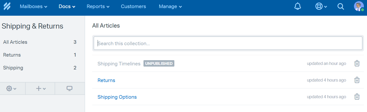 Note: There is no method for you to recover a deleted article, category, or collection in Docs. If you find that something has been deleted in error, reach out to our support team for an assist. We'll need as much information about the article, category, or collection you can remember — full titles and previous URLs are really helpful!
