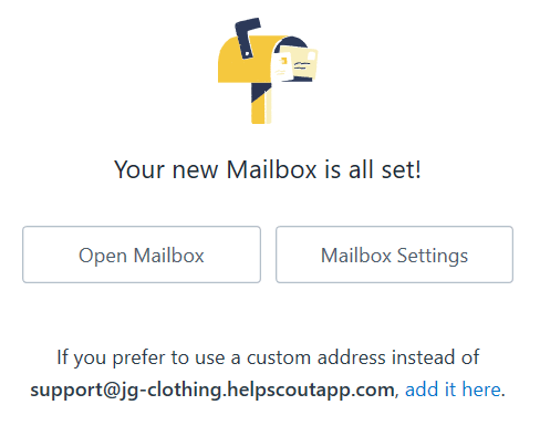 You'll see a confirmation that this new email address has been created and you can choose Open Mailbox to go right to the new Mailbox you just created. If you would like to continue to Customize your Mailbox Settings, click the Mailbox Settings button. If you are using the address you created with the helpscoutapp.com domain, you're all set!