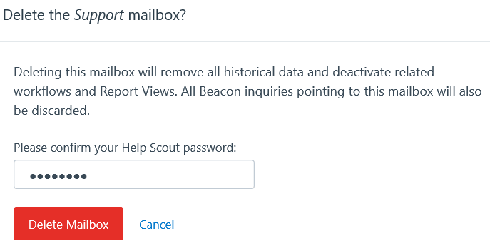 Just head into Manage > Mailboxes and click on the Mailbox you wish to delete. Scroll down to the bottom of that page where you'll see a red Delete mailbox link. Click that link and you'll be presented with a confirmation screen. Enter your Help Scout password to confirm deletion.
