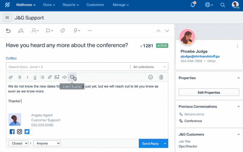 A saved reply is a snippet of text that can be quickly added to the editor when replying to a customer. Using saved replies is a great way to tackle those issues that require a standard or simple response. This article will walk you through creating, using, and managing saved replies in Help Scout.