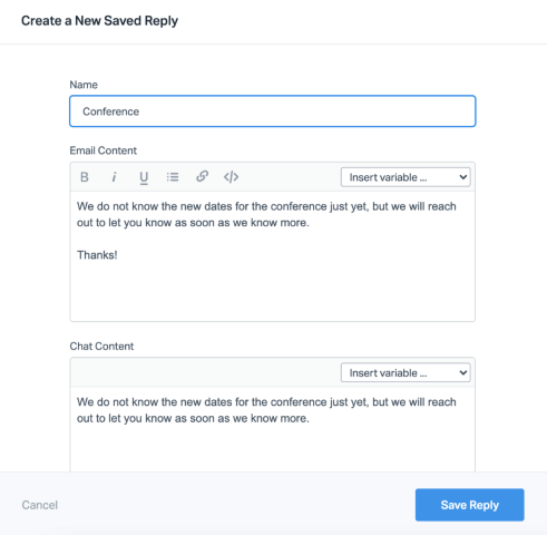 Give your new reply a name, then compose your response in the text editor. You can also create a chat version if chat is enabled on the mailbox. Click Save Reply when you're happy with the saved reply.