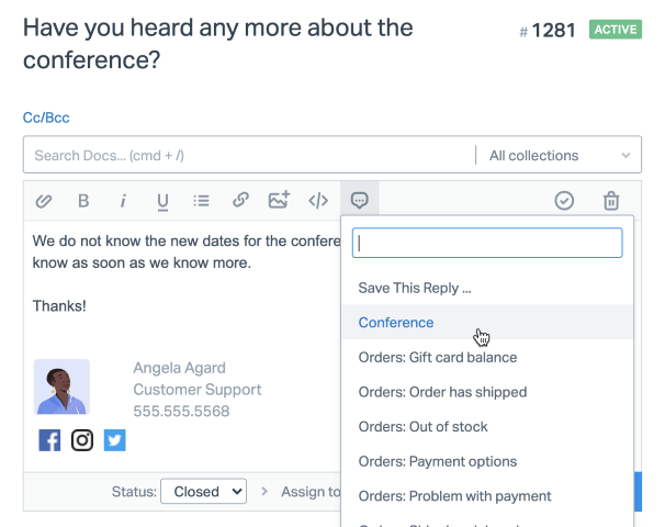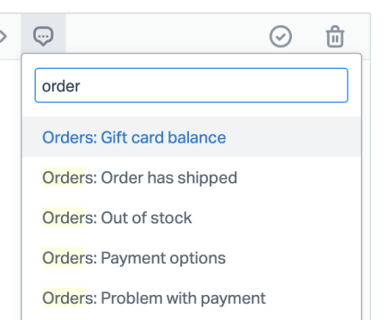Click on the Saved Reply icon on the editor toolbar. If you have more than 15 saved replies, you'll see a search bar at the top of the dropdown menu. Start typing to search the titles of saved replies or scroll, then click to insert the saved reply.