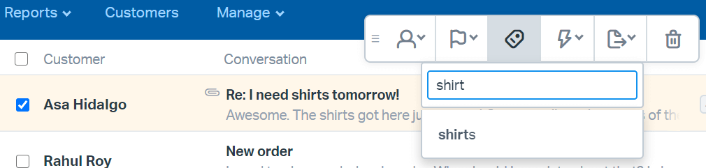 Click on the tag icon from the conversation toolbar, then type out the tag in the blank text field. As you type, you'll see a drop-down with existing tags that match what you're typing. Click on a tag from that list to select it, or keep typing.