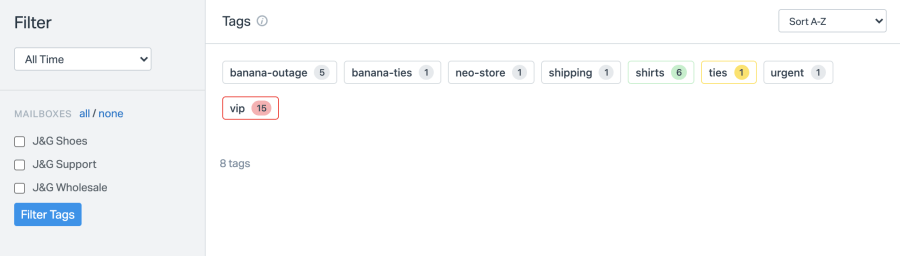 Head over to Manage > Tags to see all of your currently in use tags across all mailboxes. Use the Filter menu to choose to only see tags for a specific time frame or specific mailboxes. Note that filtering here only filters the view on this page; if you edit or delete a tag, you are taking that action on all instances of the tag across all time frames and mailboxes. Sort in the top right corner allows you to sort alphabetically or by the use count.