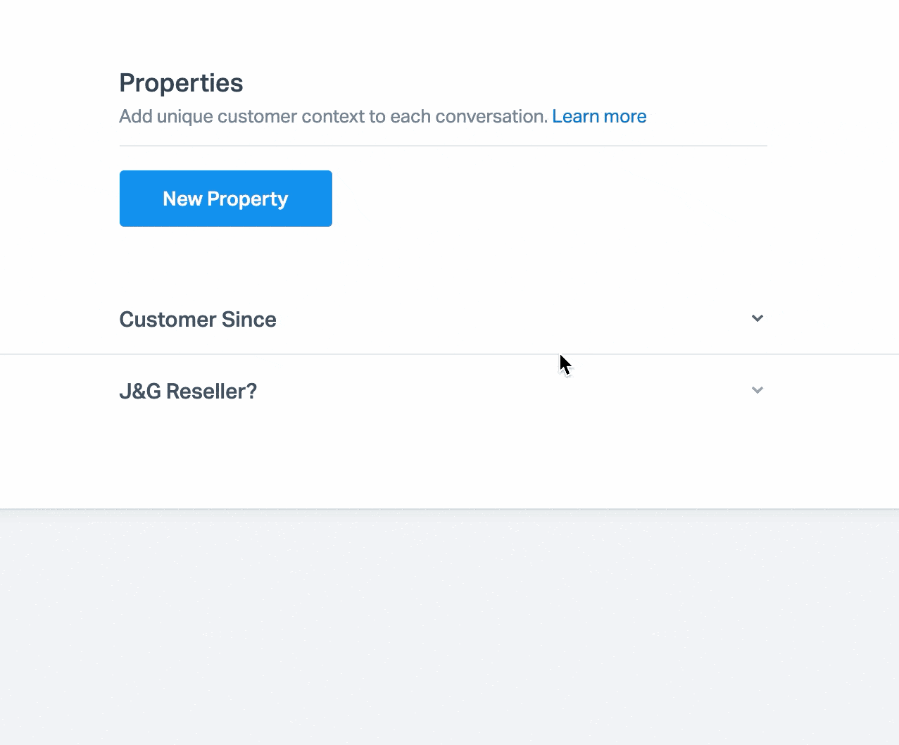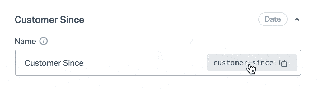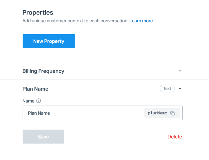 The property name is the label for the field as it appears in a customer profile or in the sidebar of a conversation. The name can be up to 100 characters, including spaces and special characters.