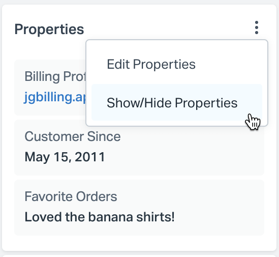 Each Help Scout user can reorder or choose to show or hide properties as they prefer. Click the three dot option menu and choose Show/Hide Properties.