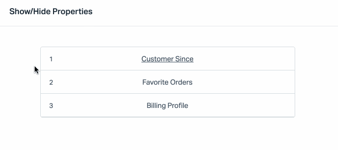 Mouse over the number in the list and click and drag to reorder the display of properties in the sidebar. Click once to hide or show each property. Hidden properties will show in this list as greyed out with strikethrough text, but will no longer show in the conversation sidebar.