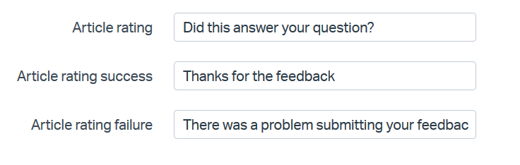 To translate the rating question, head over to the Translate tab of your Docs site settings and enter your preferred wording for the Article rating options.