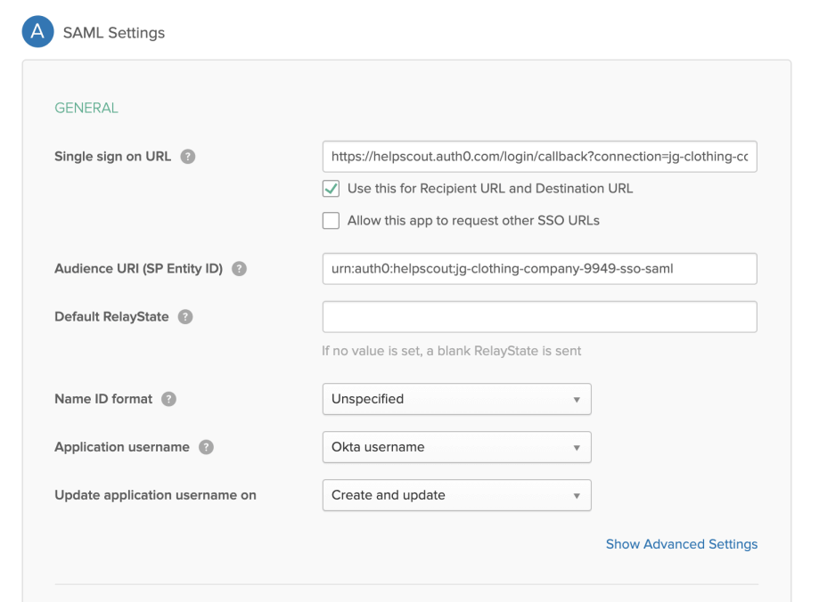 Manage > Company > Authentication.Do not toggle Enable SAML just yet! Take note of the Post-back URL and the Audience URI at the bottom of the page in your Help Scout account. You will need to copy and paste this information into Okta. You'll come back to this page to Enable SAML before the end.