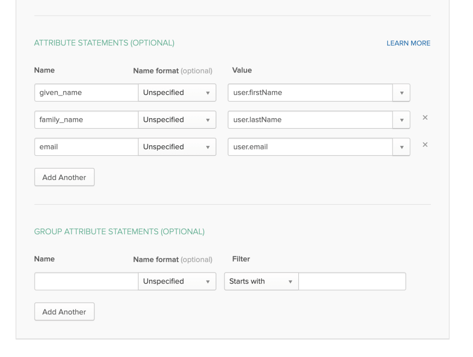 Scroll down to the ATTRIBUTE STATEMENTS (OPTIONAL) section on this same page. Add 3 attributes here as shown below, then click Next.