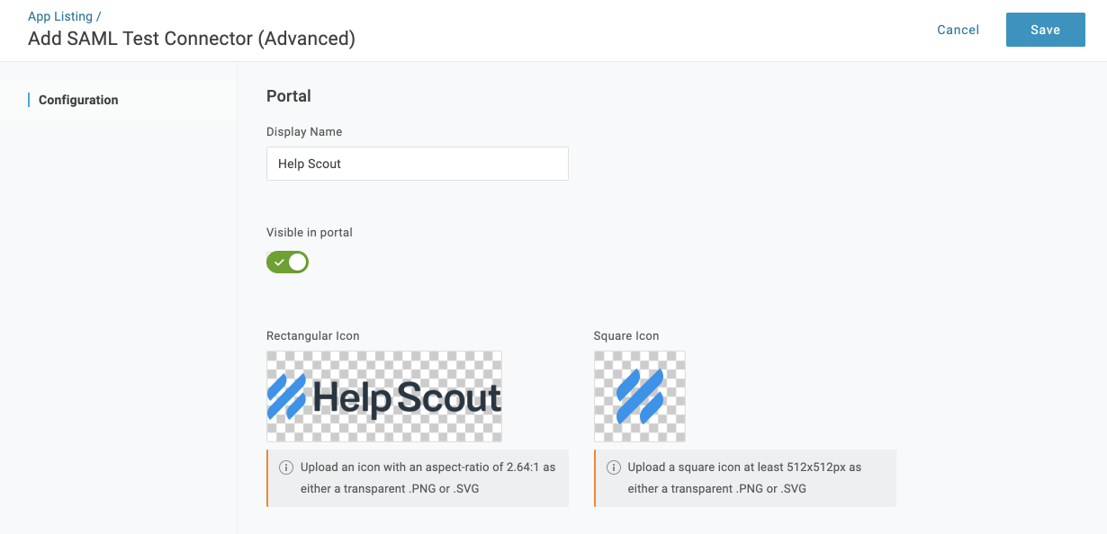 Help ScoutDisplay NameVisible in portalRectangular iconSquare iconSave