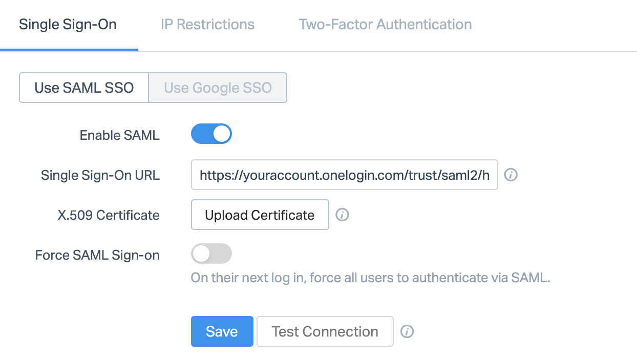 Manage > Company > AuthenticationEnable SAMLSAML 2.0 Endpoint (HTTP)Single Sign-On URLForce SAML Sign-inalwaysSave