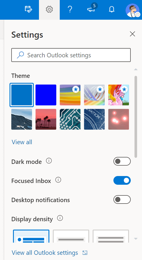 Click on the gear icon in the upper right-hand corner, then View all Outlook settings at the bottom of that menu.
