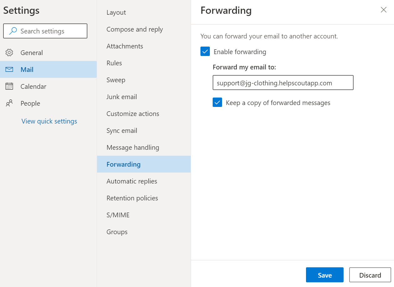 Choose Mail, then Forwarding. Click Enable forwarding and paste in your Help Scout email address. We recommend also checking Keep a copy of forwarded messages as an archive. Click Save at the bottom of this screen then close the menu by clicking the x in the top right corner.