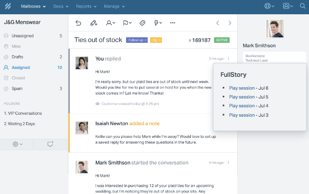 The FullStory app for Help Scout shows links to the user's most recent sessions right in the ticket sidebar. The links give you one-click access to playback of the user's actions when they filed a ticket. Here's a snapshot of what it looks like in Help Scout: