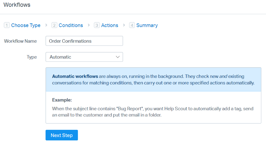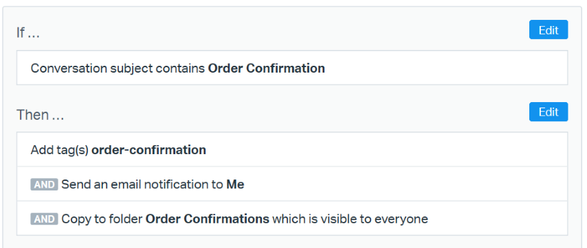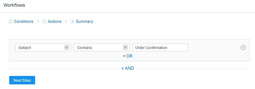 Workflows contain conditions, operators, and actions. Use those to create if-then statements to perform actions on conversations. For example, if the subject line contains "Order Confirmation", then add a tag, send an email to the customer, and copy the email to a folder. Workflows can be either manual or automatic.
