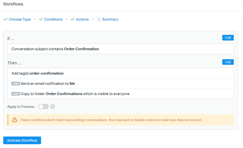 Note: If no previous conversations match your conditions on an automatic workflow, you will see a note as pictured above. If you believe you should see matching conversations here, click Conditions at the top of the page to review and edit your conditions before you activate. For more on the Apply to Previous setting, see Automatic Workflows: Apply to Previous.