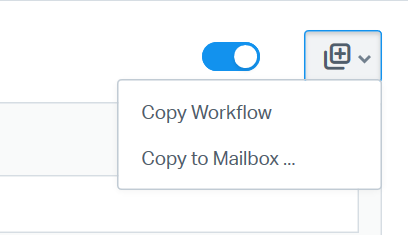 The + dropdown menu next to the toggle contains the copying options. Choose Copy Workflow to duplicate the workflow in its current mailbox. Copy to Mailbox... will allow you to copy the same workflow to a different mailbox.