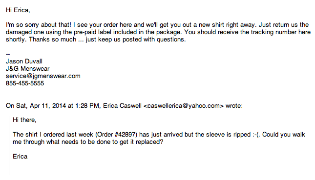 Our template looks and feels like a regular email sent from your average email client. In the example below, Erica is the original customer, and Jason is the Help Scout User who replied to the message.