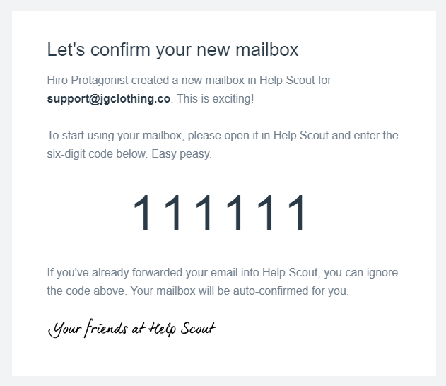 Your confirmation email will look like the one below. Type the code back into the box in Help Scout, click Confirm, and you're all done!