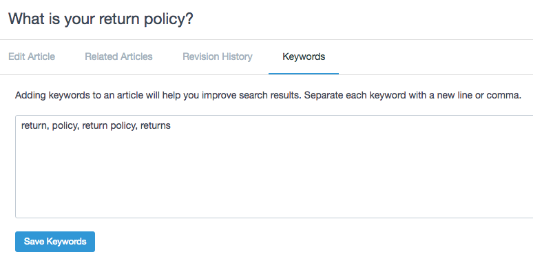 Do you see terms in the failed searches that you'd like to match to articles you already have? Add them to the Keywords in your article! For example, if you have a word or brand name that is commonly misspelled or has alternate spellings you didn't use in your article, add those other spellings to the Keywords for that article.