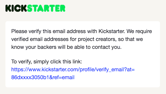 Kickstarter will send a verification email to confirm the email change. You should find this message in your Help Scout mailbox, or externally, in the mailbox that's forwarding to Help Scout. Open it up, and click on the confirmation link.