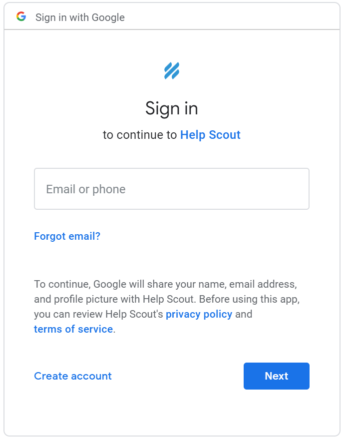 If your Help Scout account is set up to use the Google Workspace integration, you can log in using your Google account. Your Help Scout administrators may have chosen to only allow you to log in using the Sign in with Google button.