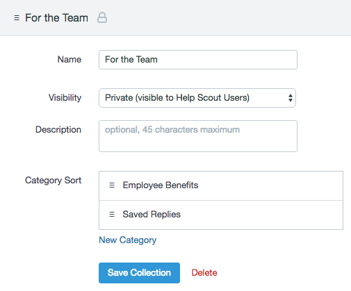 Clicking on a collection lets you customize the name, visibility, and category sorting order. You can modify collection settings whenever you'd like. If you don't have any categories just yet, create one (or a few) before moving on. You can reorder categories by dragging them up or down on the page. Don't forget to save your changes. If you delete a collection, any existing articles or categories that belong to that collection will also be deleted.