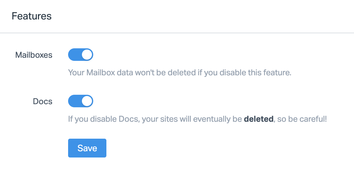 If you're only using Docs, disable Mailboxes here to hide mailbox features in the Help Scout app. Disable Docs if here if you will not be setting up a Docs site at all and wish to hide all Docs features.