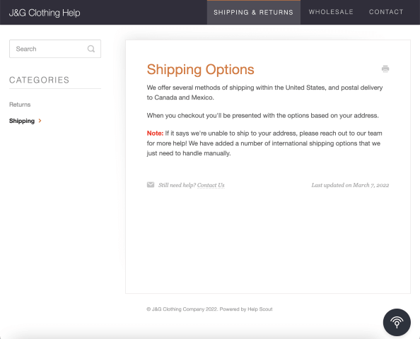 This will place a default Beacon widget on your Docs site with the contact form only, add a Contact link in the top navigation, and add a note to the end of each article with a link to contact you if visitors need more help.
