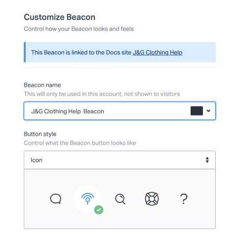 You can customize the look and feel and some options for the Docs site Beacon, including offering live chat. Click Customize Beacon to explore these options.