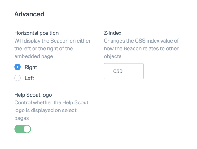 If you are using any custom CSS with Docs and find the Beacon isn't fitting just right, you can use this to alter the z-index value to change the stack order of Beacon so that it’s not bumping into other elements on the page. There’s no minimum or maximum value, and you can use negative values, too. If you've worked with a developer to build custom CSS, reach out to them for any guidance on what this needs to be set to for your custom CSS.