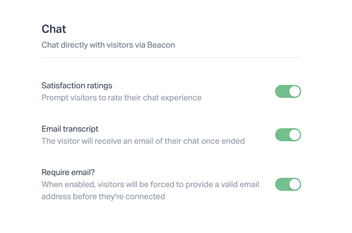 Toggle on to allow chat through your Docs site Beacon. Scroll down to find the Chat options later on the page after you toggle this on.